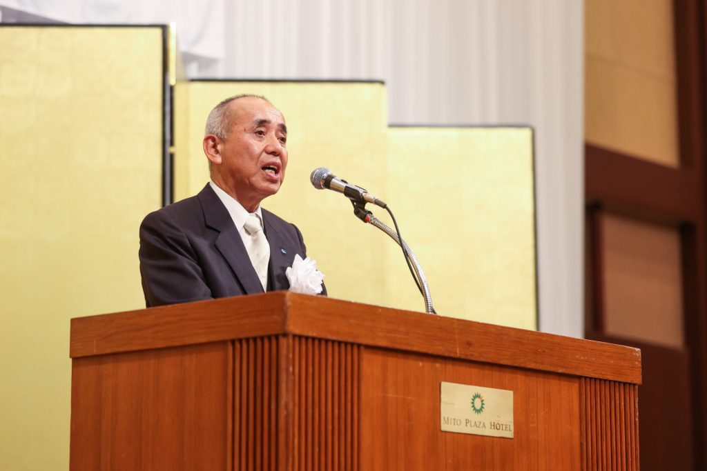 式典には、茨城県医師会ほか県内の郡市医師会や医療機関、国会議員の先生方など約250名のご出席をいただき、来賓祝辞として茨城県知事 大井川 和彦 様のほか、水戸市保健医療部長 小川 佐栄子 様よりお祝いの言葉を賜りました。続いて、小林常務理事兼事務局長が50年の歩みの事業報告を申し上げ、日頃より各種健診事業の運営にご協力いただいております事業所、医療機関、嘱託医師など178名の皆様に対し感謝状の贈呈を行い、当センターを長年ご利用いただいている元参議院議員 岡田 広 様からお祝いの言葉を賜りました。